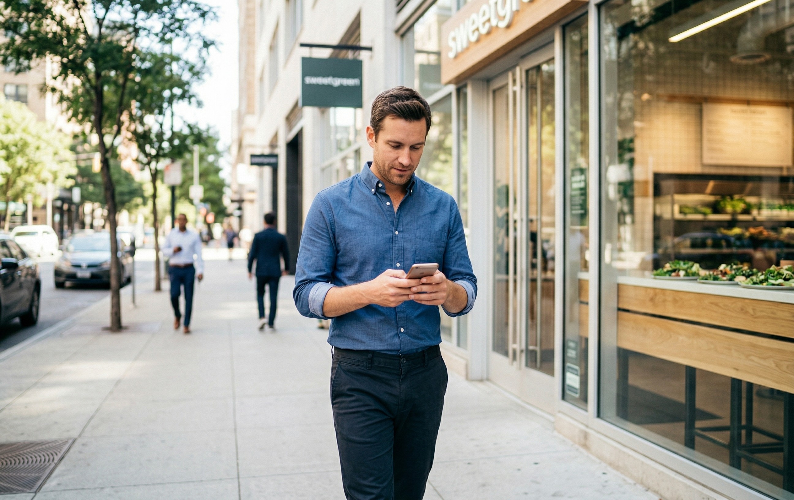 Lunch near the office. A phone buzzes: "$5 back on orders over $25 at Sweetgreen. You're here now." Merchant-funded. Personalized. Delivered at the only moment it'll land.